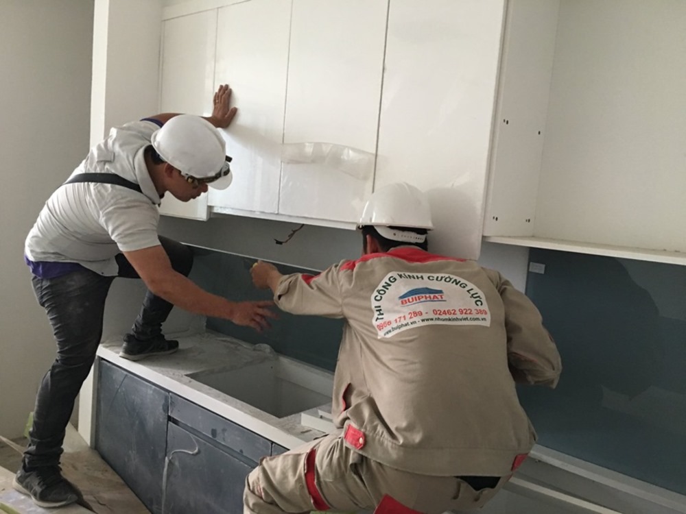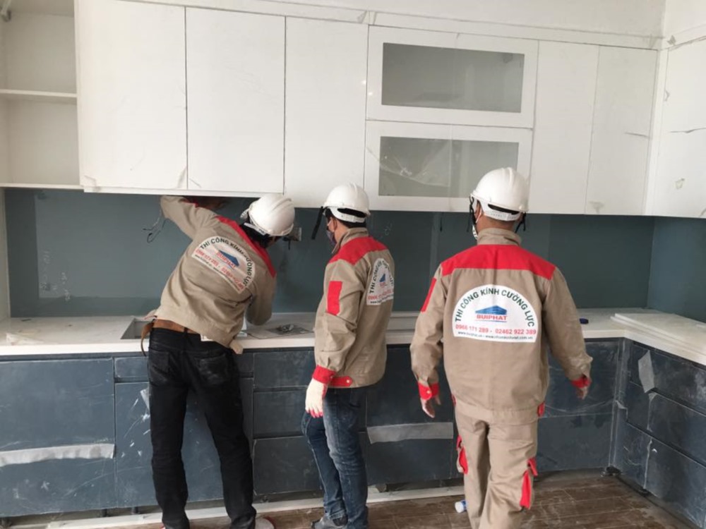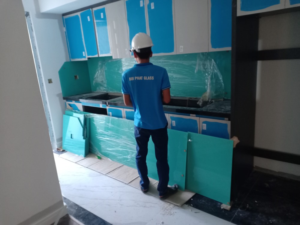 Bùi Phát thi công kính ốp bếp tại Chung cư Metropolis Liễu Giai, sử dụng kính cường lực bền đẹp, chống bám bẩn, đảm bảo thẩm mỹ và tiện nghi.