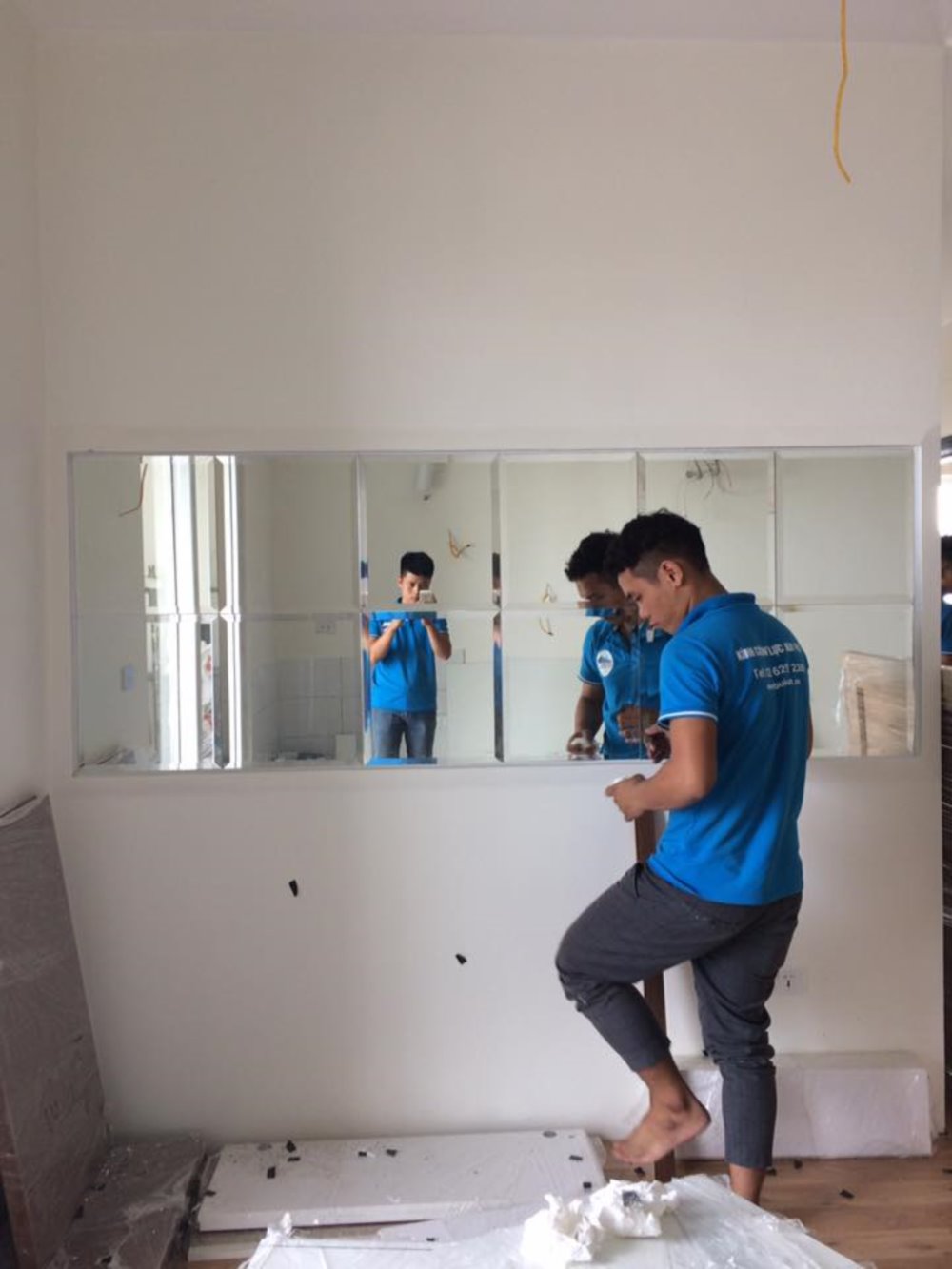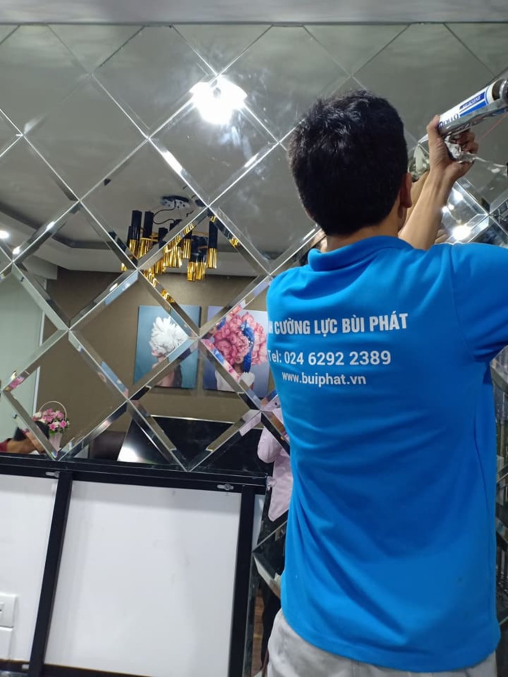 Gương được lắp đặt bằng keo chuyên dụng kết hợp nẹp cố định, gương dày 5mm, gia công CNC chuẩn kỹ thuật. Khi thi công đúng quy trình, gương hoàn toàn không bị rơi hay cong vênh. Bùi Phát có 11 năm kinh nghiệm, đội thợ lành nghề và bảo hành công trình sau lắp đặt.
